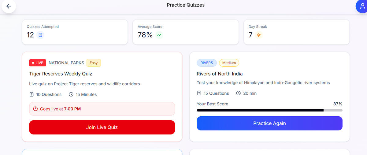 Dedicated quizzes based on PYQs, powered by an AI quiz engine that also adds current, relevant questions - helping you improve your scoring in future exams.